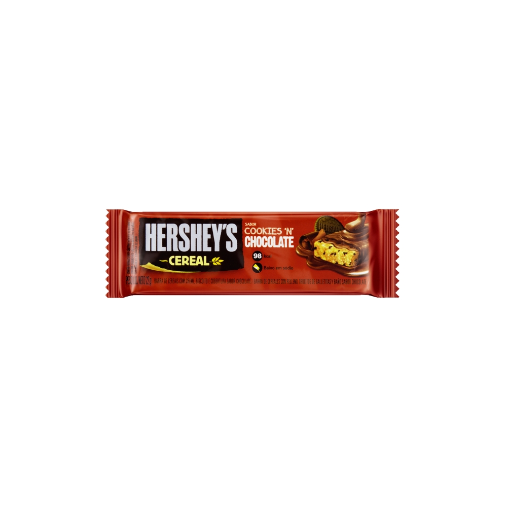 Combinação de cereais com recheio cremoso de Cookies ‘n’ Chocolate, coberta com o delicioso chocolate Hershey’s.